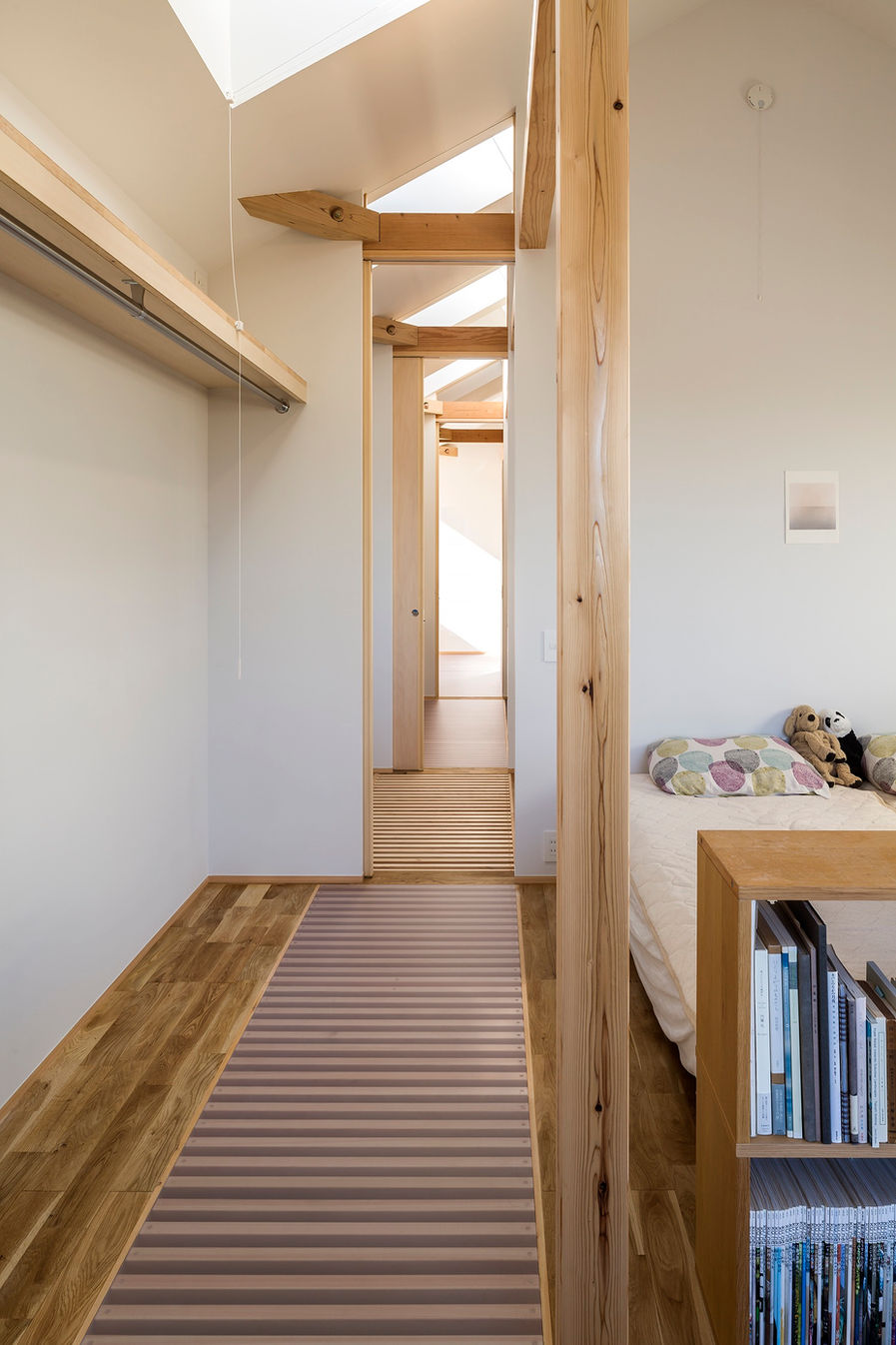 この家は南北方向の基本断面形状が東端から西端まで全く同じという自身初の試みを行っています。いわゆる金太郎飴のようなかたちで構成されたプランです。家の中の最外周を1、2階ともに回遊することのできるので見通しも良く、結果的に光、風、空間が全て抜けの良い稀有な構成となったと思います。
