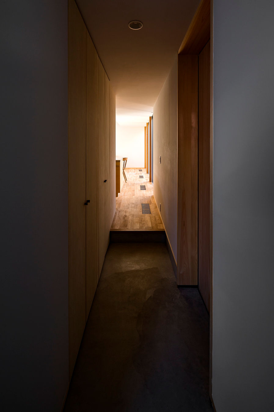 このかたちに至ったのは屋根の高さは年中通して日照が期待できたこと、北側に庭を配置して壁を設置することで壁面が日射を受けてくれるので、家の中から明るい面を眺めることができることなどが主な理由なのですが、2階の床をルーバー材(スノコ状)にすることで、天窓の明かりを1階まで届けることができる仕組みや、段階的に天井高を変化させて自然と風が流れる断面を検討しながら、詳細を掘り下げていきました。