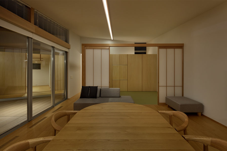 建物の骨格は、中心に中庭を抱く「ロの字」のプランです。 これは、周辺の高層建物からの視線を遮り、屋内のプライバシーを確実に守るための選択です。中庭に面する部分はすべてハレの空間とし、寝室や水回りといったプライベートな機能は、中庭との間に設けた縁側を介して外周部へ配置。これにより、極めて明快なゾーニングと動線計画が実現しました。